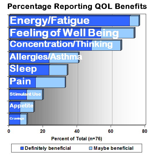 A total of 76 users were reached in three calling periods. Some QOL measures did not change, while other specific measures of QOL were reported to be significantly improved. Fatigue was decreased in over 70% of users; other CNS symptoms (mood and ability to concentrate) and allergy symptoms improved in 40-70% of users.